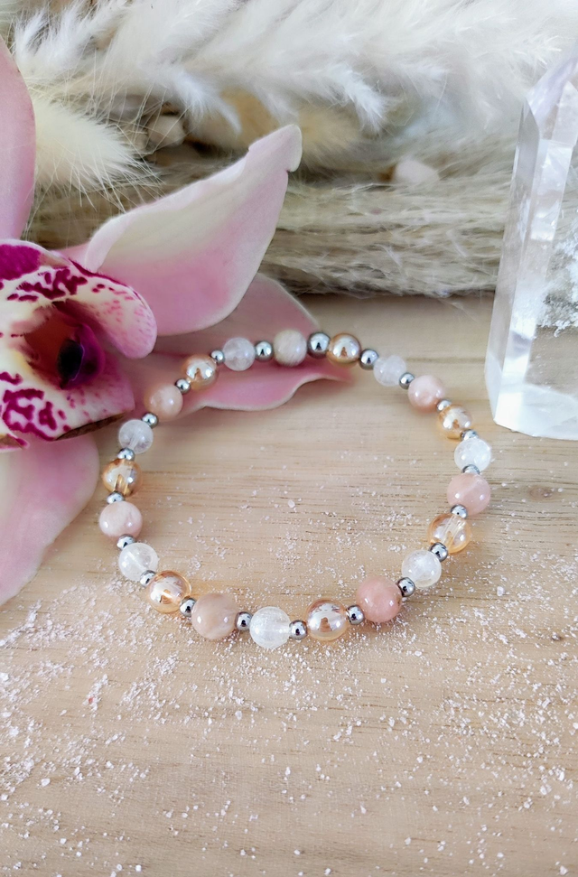 Bracelet femme en Pierre de Soleil, Citrine et Quartz Aura (Cristal de roche pulvérisé à l'or).