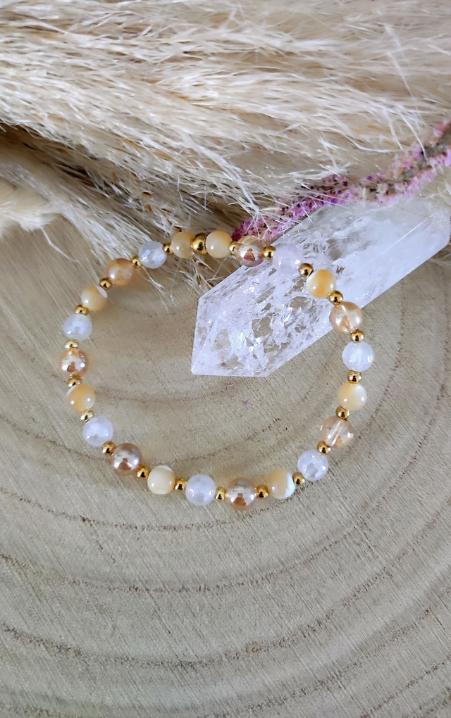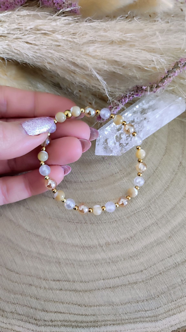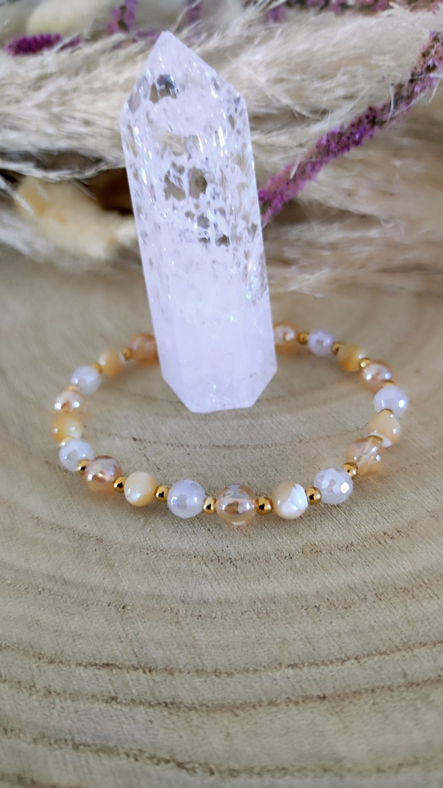 ✨ Bracelet en Perle Nacre, Agate blanche facettée et Quartz Aura.