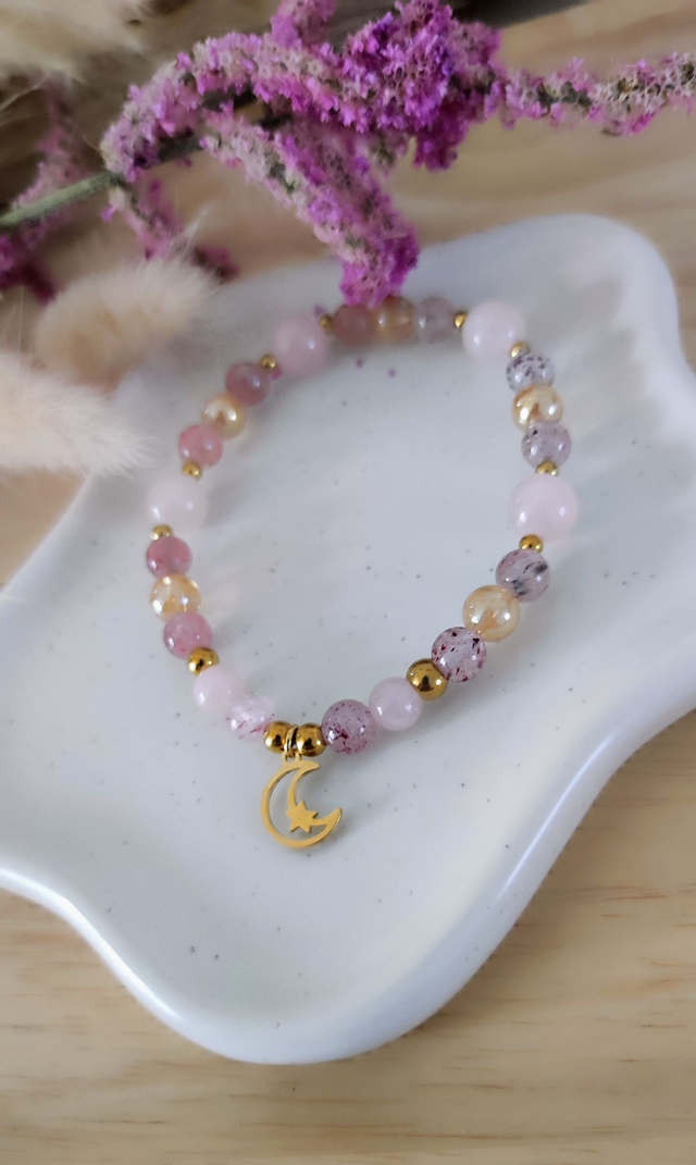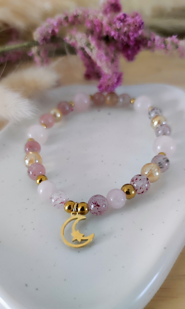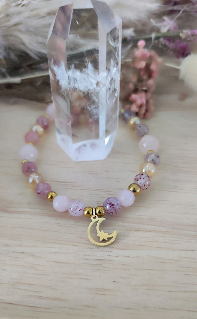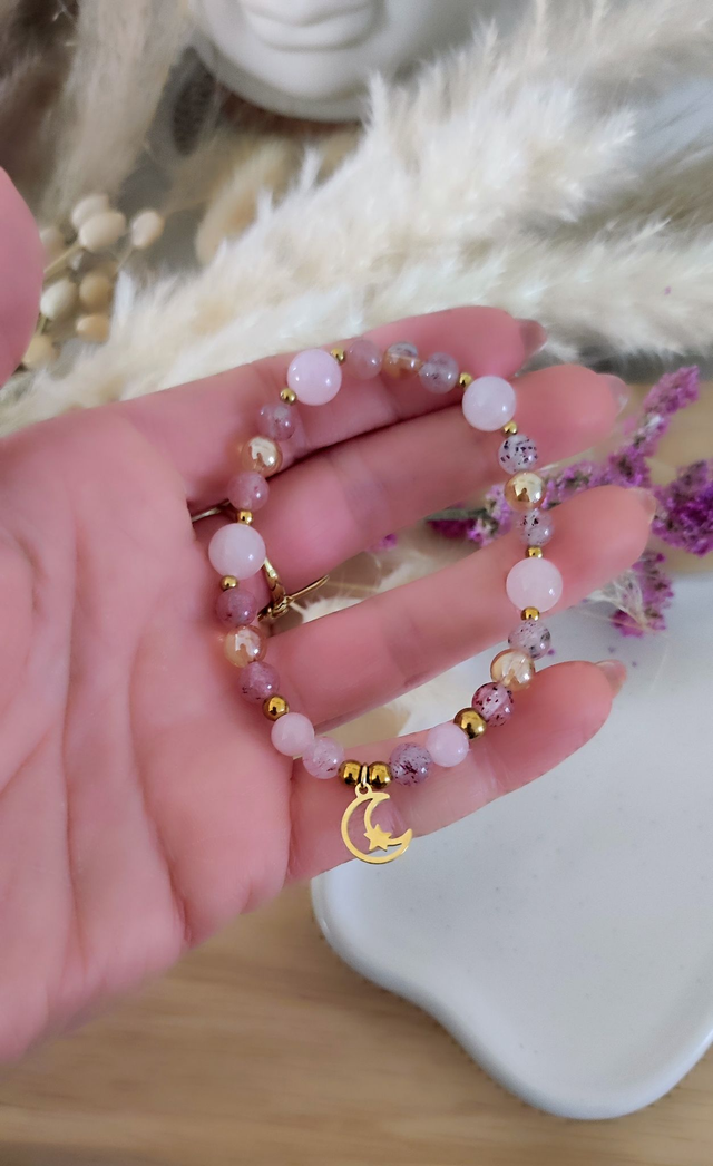 ✨ Bracelet en Quartz fraise, Quartz rose et Cristal de roche aqua aura.