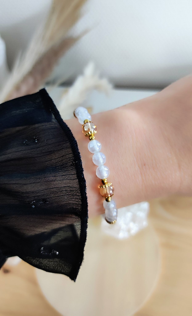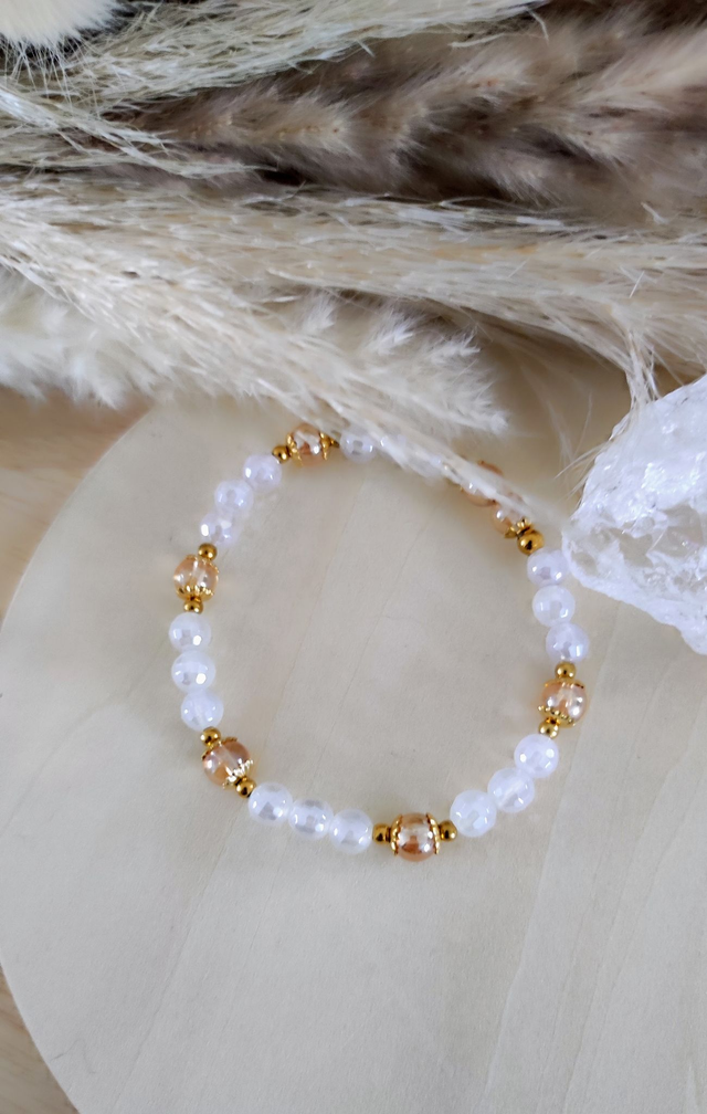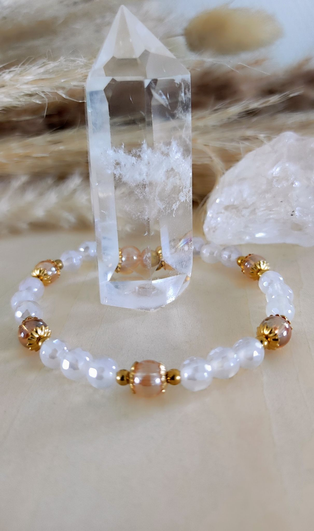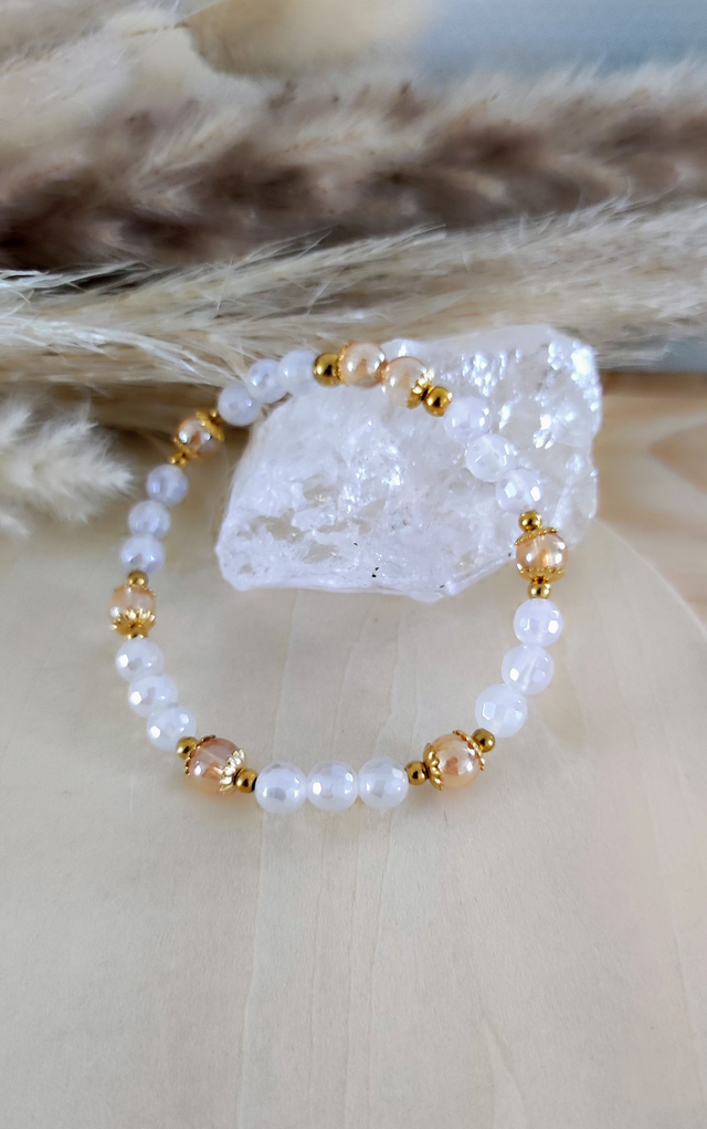 ✨ Bracelet en Agate blanche facettée et Cristal de roche aura (Cristal de roche pulvérisé à l'or fin).