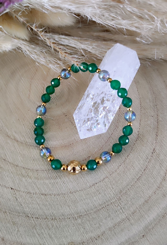 ✨ Bracelet en Agate verte facettée et Cristal de roche aura (Cristal de roche pulvérisé au titane).