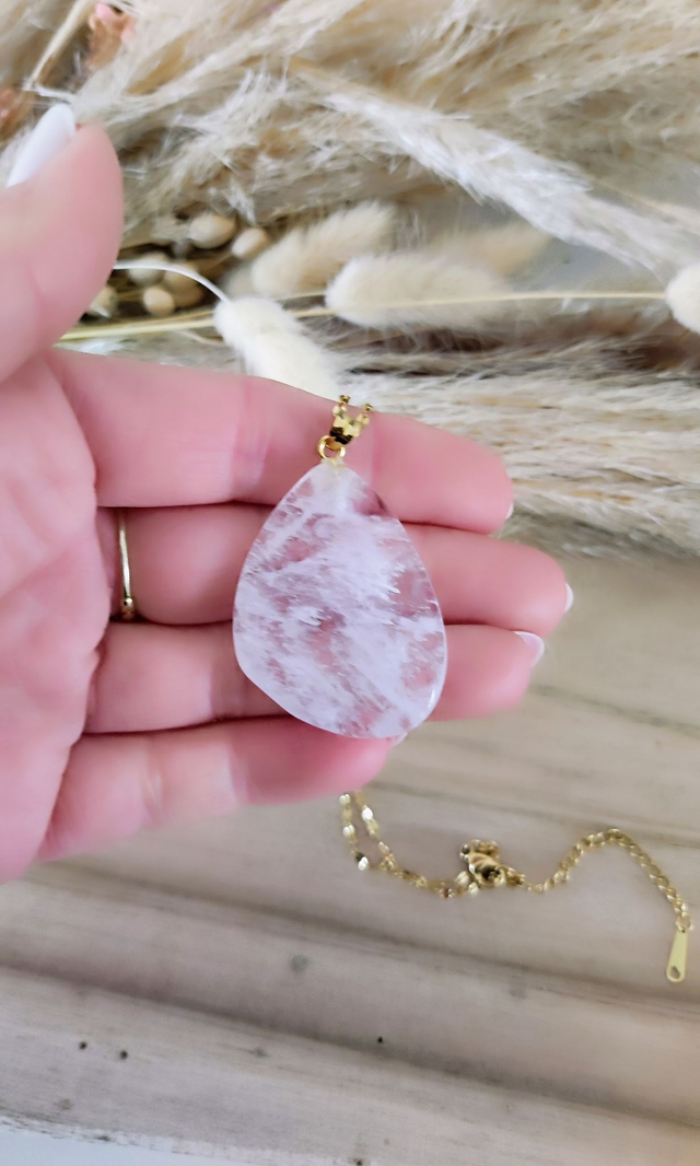 Taille de la pierre environ 28x36x9 mm, la bélière et la chaîne sont en acier inoxydable doré.